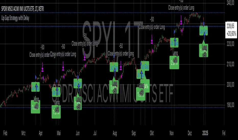 This strategy, titled “Up Gap Strategy with Delay,” is based on identifying up gaps in the price action of an asset. A gap is defined as the percentage difference between the current bar’s open price and the previous bar’s close price. The strategy triggers a long position if the gap exceeds a user-defined threshold and includes a delay period before entering the position. After entering, the position is held for a set number of periods before being closed.