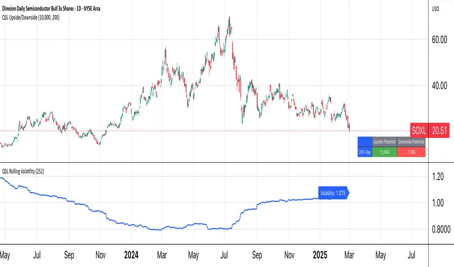 The QSL Upside/Downside Indicator helps traders estimate potential gains and losses using Conditional Value at Risk (cVaR), a statistical measure that assesses both downside risk and upside potential beyond standard volatility. Instead of fixed timeframes (daily, weekly, etc.), traders can set a custom lookback period (in days) to analyze market behavior over their preferred time frame.