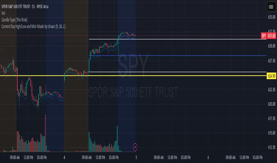 This TradingView indicator plots the current day's high, low, and mid (50%) levels, based on the daily timeframe, and displays them on any intraday chart (e.g., 15m, 1h, etc.).