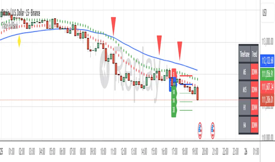 **Trade Pull Back** is a comprehensive pullback trading system that combines trend-following principles with precise entry timing using candlestick pattern confirmation. This indicator is designed for traders who want to enter trending markets at optimal retracement levels with pre-calculated risk-reward ratios.
