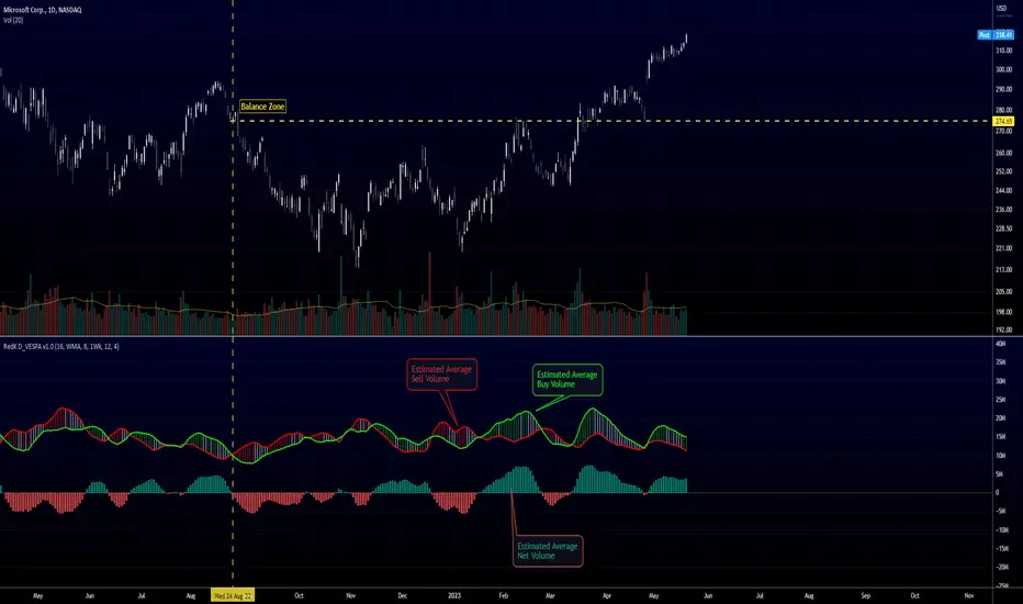 The "Directional Volume EStimate from Price Action (RedK D_VESPA)" is another weapon for the VPA (Volume Price Analysis) enthusiasts and traders who like to include volume-based insights & signals to their trading. The basic concept is to estimate the sell and buy split of the traded volume by extrapolating the price action represented by the shape of the associated price bar. We then create and plot an average of these "estimated buy & sell volumes" - the estimated average Net Volume is the balance between these 2 averages.