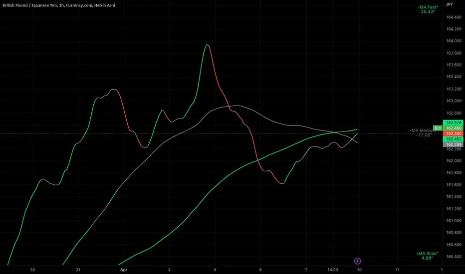 Ignition Cha Cha Cha (ICCC) is a 3 color coded moving average indicator which numerically quantify the angle of their trends. I have labeled them as fast, medium and slow. The trend colors are Green for bullish, Red for bearish and Grey for sideways. The sideways movement can be user defined for all 3 in the settings under Threshold. If you regard for example anything under 10º as sideways then place 10 in the corresponding threshold and any angle under 10º will give a grey moving average and a grey labeled text. I use this chart in several ways. If you don't want moving averages all over your Chartistic Masterpiece you can turn off the plots and leave the numeric angles which will give you an overview of the trend. Conversely if you want to make the ultimate trend chart you can setup a 4 chart layout, Weekly, Daily, 12 hour and 4 hour and add the indicator with 200/50/25 moving averages and look for confluence. I find the best way for this is turn off the candles and use the moving averages with the numeric labels. You also have the ability to turn off and on different aspects of the indicator so that there is good control over its look. Also I have given the indicator lots of Alert presets for all 3 of the moving averages so you can avoid demented screen-stairing. Please forgive the name, my mother made me do Ballroom dancing lessons as a kid.
