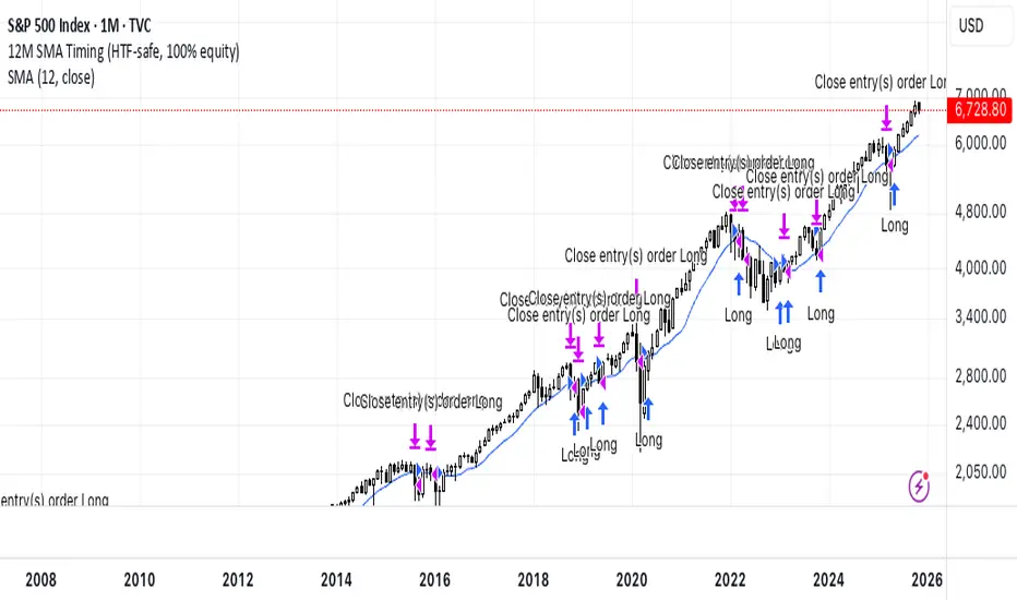 Buy when S&P500 closes above 12M moving average. Sell when it closes below it. Monthly only.
