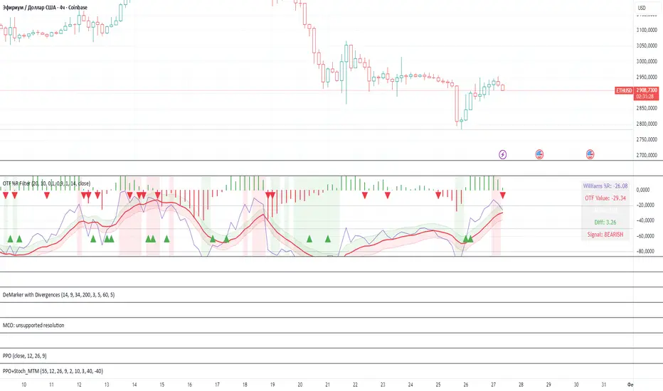 An adaptive digital filter has been applied to the %R indicator to track the trend and smooth out market noise with minimal phase delay. It was developed by John Ehlers based on the principles of digital signal processing — the optimal Kalman filter (R.E. Kalman) and optimization of the filter response to signal characteristics. It works well on older TF 1h-4h-1d. It doesn't work well for 15-minute sessions. The histogram above the graph shows the percentage discrepancy between the filter line and the main indicator.