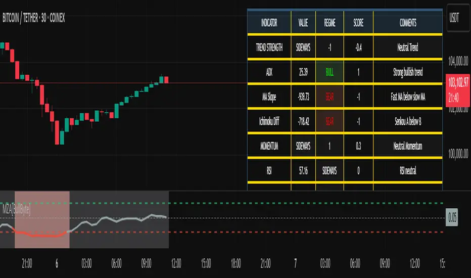 The Market Zone Analyzer[BullByte] is a Pine Script™ (version 6) indicator designed to streamline market analysis on TradingView. Rather than scanning multiple separate tools, it unifies four core dimensions—trend strength, momentum, price action, and market activity—into a single, consolidated view. By doing so, it helps traders: