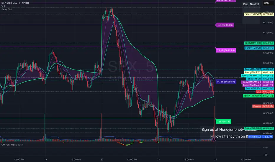 This script combines VWAP, EMAs, dynamic key levels (SpacemanBTC-style IDWM), premarket high/low, monthly Fibonacci zones, and an ATR/RSI stats panel into one branded layout using Fancy’s signature color palette (bright green, teal, purple, and hot pink).