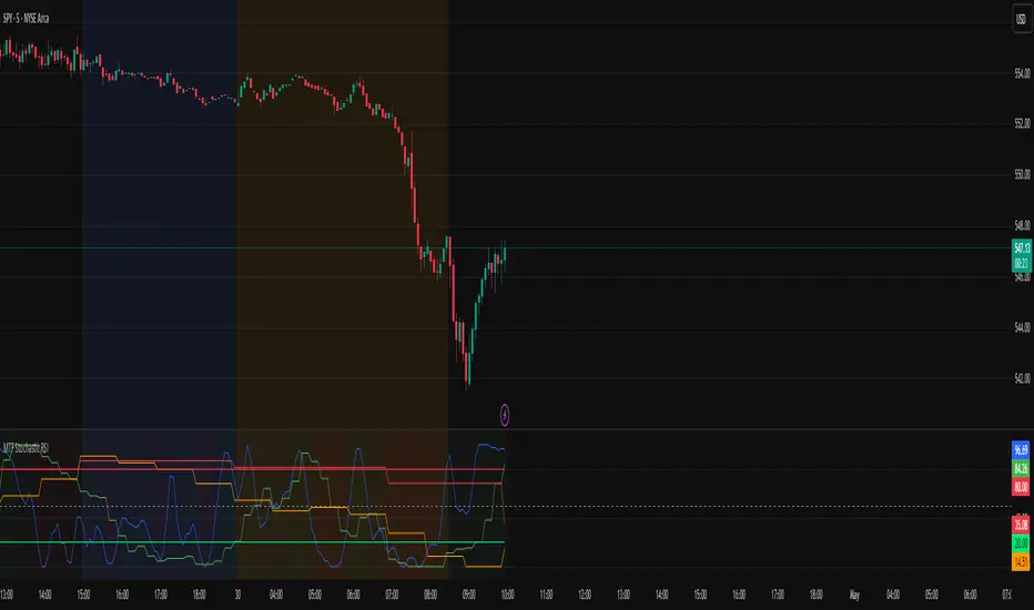 The indicator builds upon traditional Stochastic RSI by applying it to multiple timeframes in