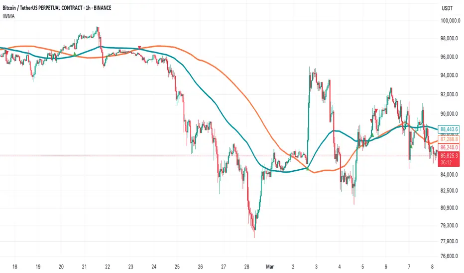 The Inverted Weighted Moving Average (IWMA) is the reversed version of WMA, where older prices receive higher weights, while recent prices receive lower weights. As a result, IWMA focuses more on past price movements while reducing sensitivity to new prices.
