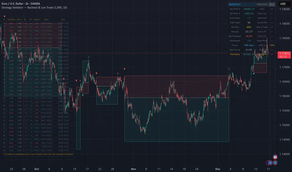 Strategy Validator is an analytical indicator for TradingView designed to evaluate trade setups, risk structure, and price behavior in real time.