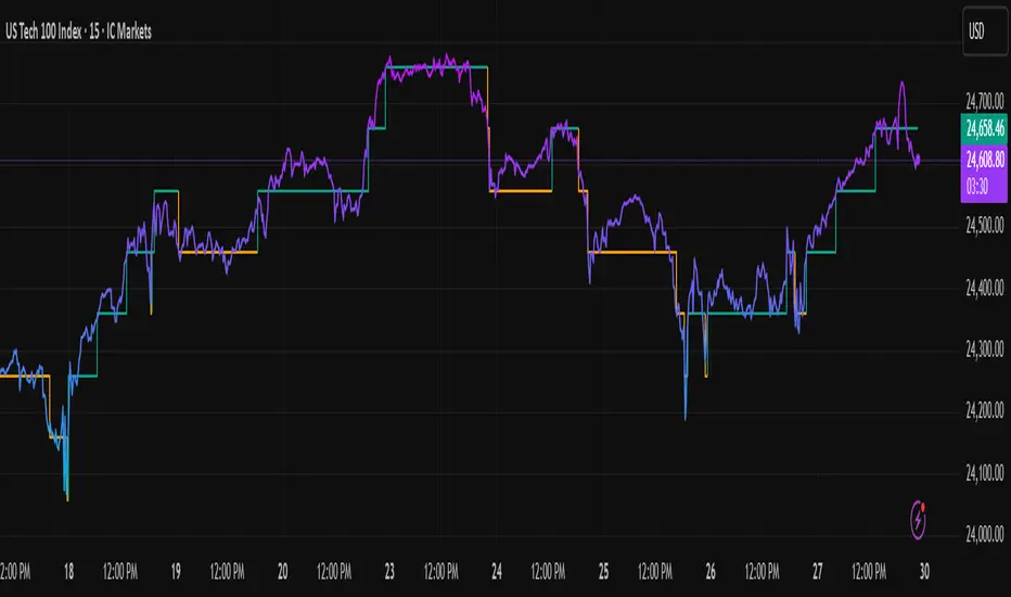 Dynamic Step-Line: Plots a Renko-style step line that adapts to price movement, making trend direction clear.