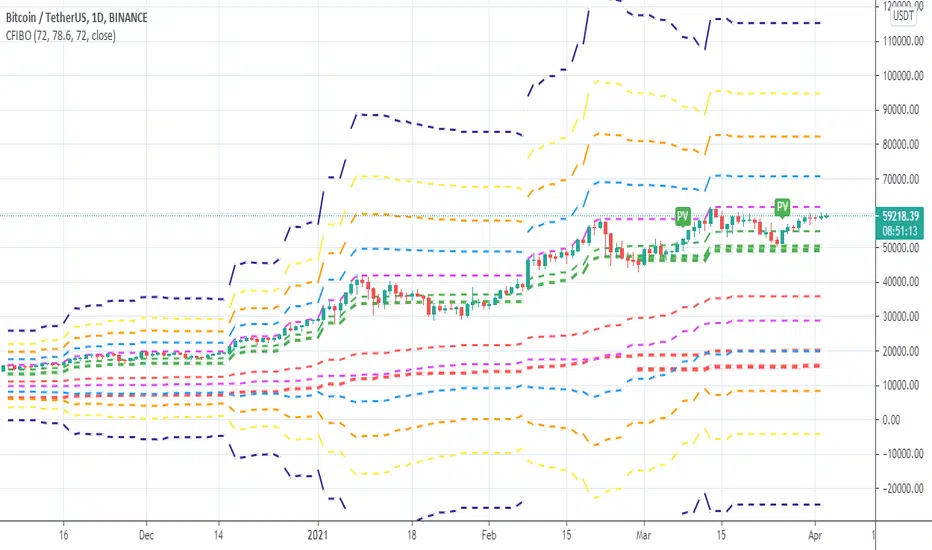 Fibonacci's retracements are show for the Donchian Channel with length 72 by default, but it can be changed to any length. They are colored as fuchsia (100%), blue (127%), orange (162%), yellow (200%) and navy (262%).
