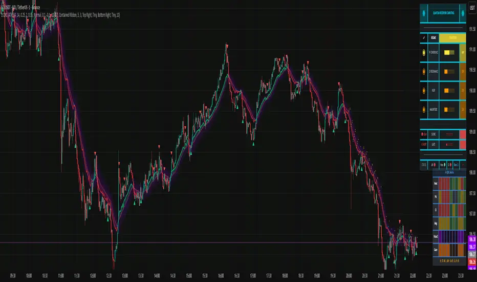 This indicator combines three structural analysis kernels (Energy, Resonance, Topology) with a 6-spin reservoir computing network to provide multi-dimensional market state monitoring. It is designed to detect structural shifts, coherence alignment, and potential entry timing through visual analytics and optional signal markers.