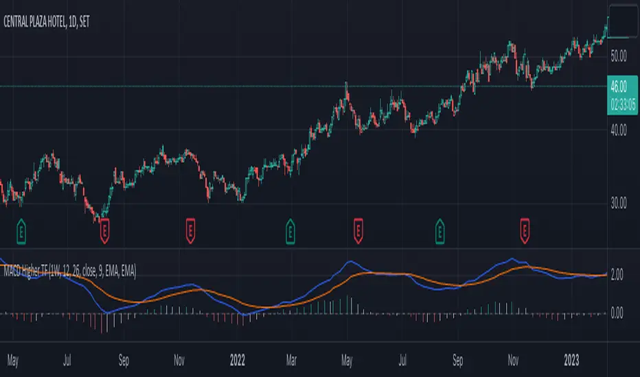 This Pine script is an indicator called "MACD Higher TimeFrame" that calculates and displays the Moving Average Convergence Divergence (MACD) on a higher timeframe. It is designed to be used on a lower timeframe chart but show the MACD values from a specified higher timeframe.