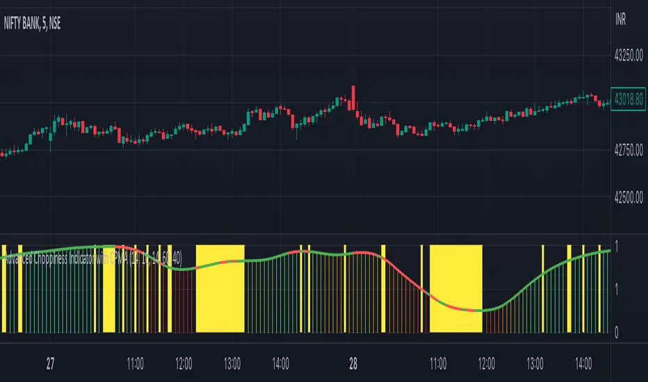 By combining the Choppiness Index, CPMA, and other visual cues, this indicator aims to help traders identify suitable trading conditions and make more informed decisions based on market trends and volatility.