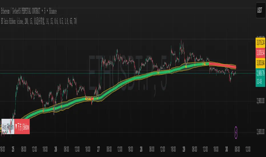 BullTrading Axis Ribbon 是一条「高周期主轴 + 自适应包络带」的趋势彩带,用来刻画价格围绕关键均衡轴的磁吸区、扩散区与趋势方向。