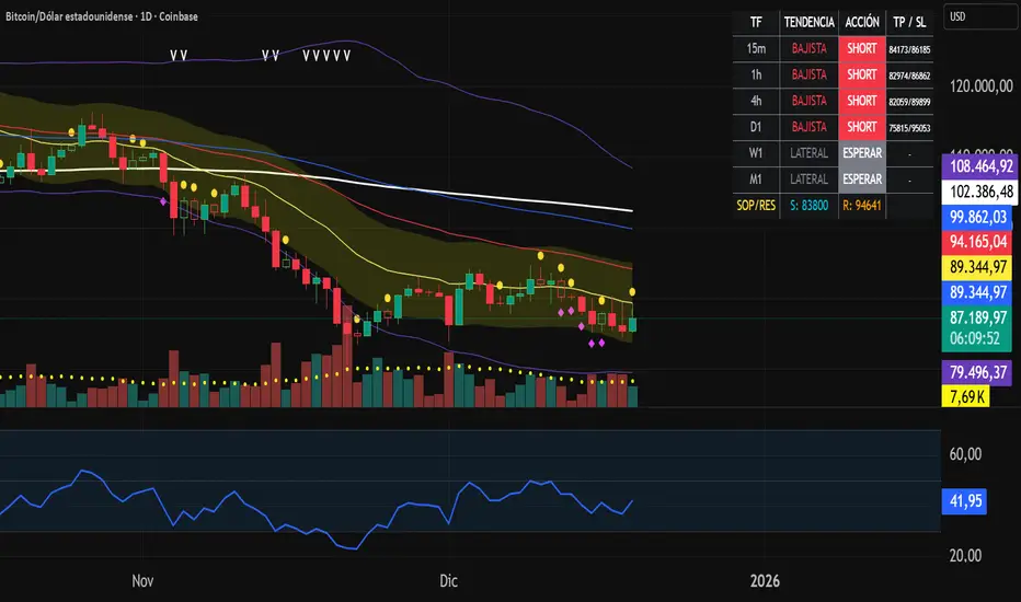 • Ideal Sell Signal: Price near resistance + Fuchsia Diamond (Squeeze) + Yellow Circle (Inside Bar) + Bearish breakout with a "V" (Volume).