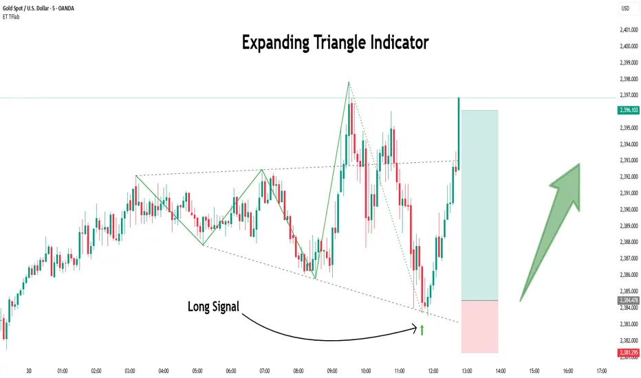The custom-built indicator for this pattern uses a combination of smart algorithms and detailed analysis of swing dynamics to automatically detect expanding triangles and highlight low-risk entry points.