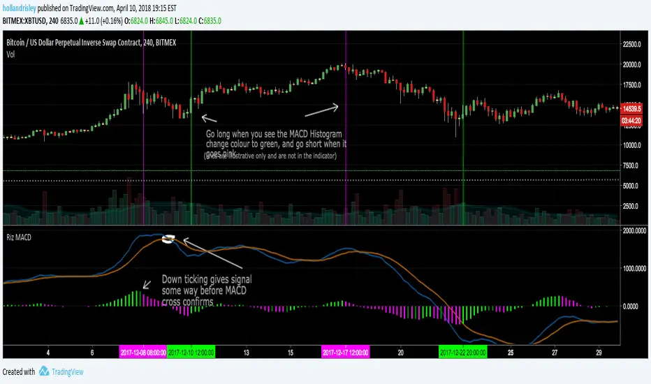 This is a souped up common or garden MACD . The Histogram is coloured giving a clear visual representation of where we are UpTicking or DownTicking on the Histogram to help support trading decisions.