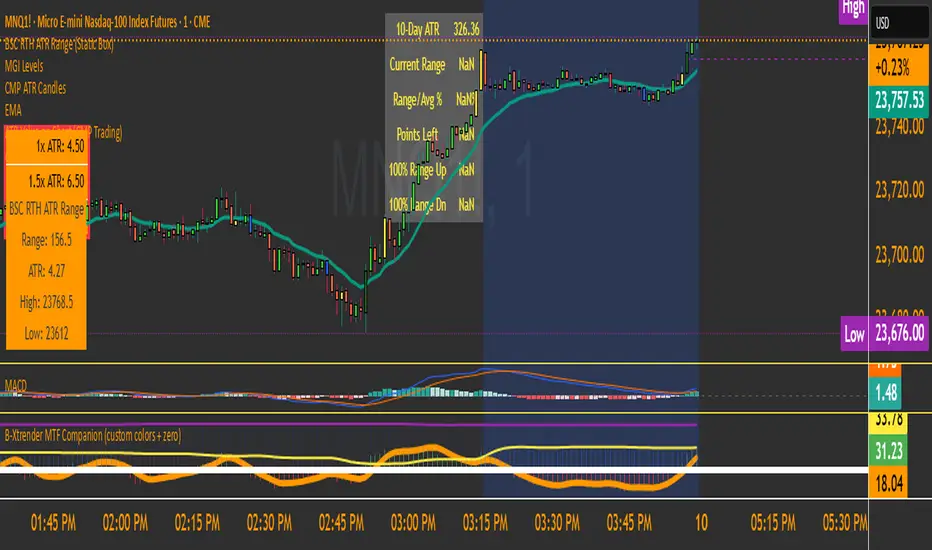 The indicator calculates the 10-day ATR using daily data and tracks the current session's range, resetting at the start of each day or session change. During market hours (e.g., 6 AM - 8 PM CDT, adjustable), it updates live, providing actionable insights. When the market is closed, it displays historical ATR while marking live metrics as "n/a" to avoid confusion. The ETH/RTH toggle ensures the range reflects either the full extended session or the core trading hours, tailored to your strategy.