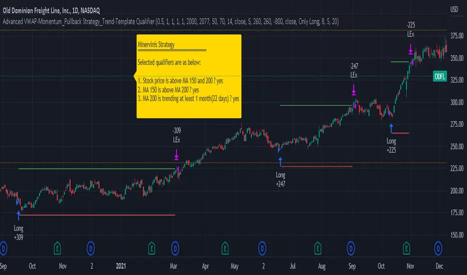1. Our script/strategy utilizes Mark Minervini's Trend-Template as a qualifier for identifying stocks and other financial securities in confirmed uptrends. Mark Minervini, a 2x US Investment Champion, developed the Trend-Template, which covers eight different and independent characteristics that can be adjusted and optimized in this trend-following strategy to ensure the best results. The strategy will only trigger buy-signals in case the optimized qualifiers are being met.