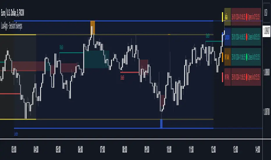 The Session Sweeps indicator combines ICT-based features for a complete trading methodology involving market sessions, market structure, and fair value gaps to find optimal entry conditions for trading price action.