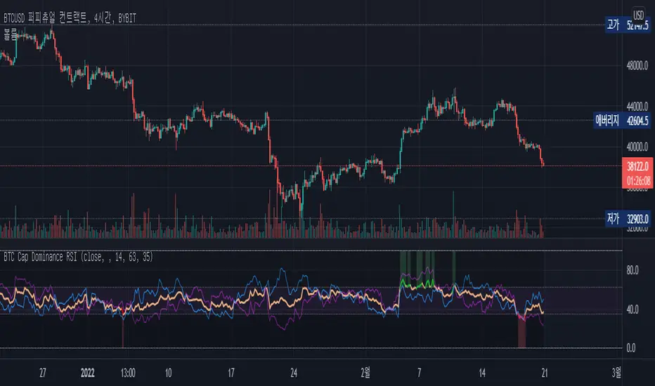 BTC Cap Dominance RSI indicator is a combination of the RSI of Bitcoin Market Cap and the RSI of Bitcoin Dominance. The concept of this indicator is to get a good grasp of the bitcoin market flow by combining bitcoin dominance as well as bitcoin market cap.