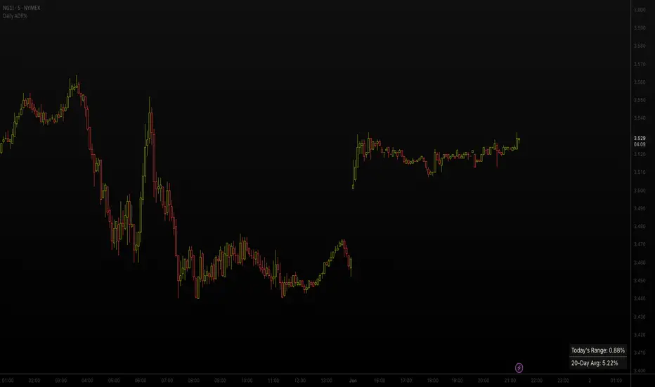 The Daily Average Daily Range (ADR) Table displays real-time volatility statistics directly on your chart. It shows both the current day's range and the historical average daily range as percentages of the current price, providing essential volatility metrics for trading decisions.