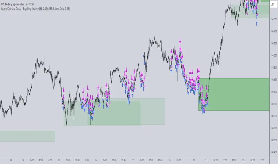 This strategy combines institutional trading concepts—supply/demand zones and engulfing candle patterns—to generate high-probability long and short trade setups. The system uses aggregated price action to identify potential reversal zones and confirms entries with engulfing candle patterns, ensuring trades are only taken when market structure shows commitment in the direction of the trade.