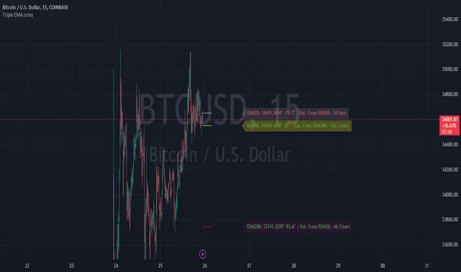 The "Triple EMA By Ozy" is a visual indicator that offers traders a clear and concise view of three exponential moving averages (EMAs) at a glance. This tool combines three common EMAs (20, 50, and 200) and additionally calculates and displays the slope angle of each EMA, allowing for a more precise identification of the current trend's direction and strength.