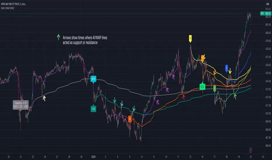 IntroductionThe Multi VWAP tool extends the concept of using the Anchored Volume Weighted Average Price, popularized by its founder, Brian Shannon, founder of AlphaTrends, and creates automatic AVWAPS for multiple anchor points, such as for 2-day, 3-day, 4-day, 5-day, and custom date anchors as well as automagically creating month-to-date and year-to-date anchors. Currently, most standard VWAP tools allow users to place custom anchored VWAPs, but the routine of doing this for every equity being watched can become cumbersome. This tool makes that process multi-times easier. Brian Shannon is also the author of “Maximum Trading Gains With Anchored VWAP: The Perfect Combination of Price, Time, and Volume”. Available at Amazon.
