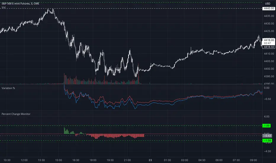 📈 Purpose: This script provides traders with a clear visualization of the percentage variation from the opening price for two major futures contracts: ES1! (S&P 500 futures) and NQ1! (Nasdaq 100 futures).
