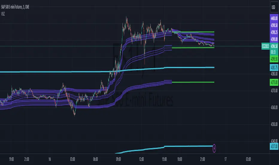 VBZ tracks the daily, weekly, and monthly highs and lows; Then plots the average (50%) between the VWAP and the respective extremes.