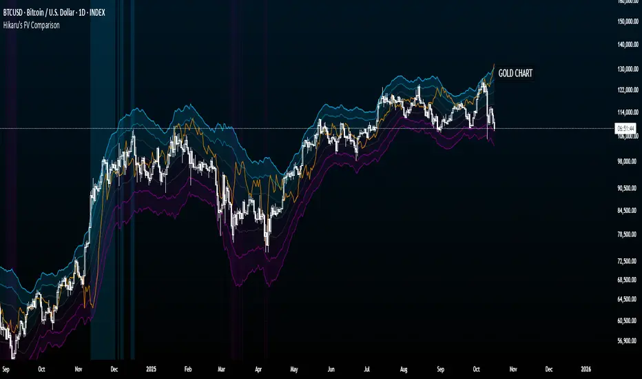 Hikaru's FV Comparison allows you to compare any two assets using Hikaru Bands. This indicator shows where your comparison asset sits within its own bands while you're viewing another chart. Perfect for spotting divergences between correlated markets - see if SPX is overbought while BTC isn't, or check if ETH and SOL are aligned in their band positions.
