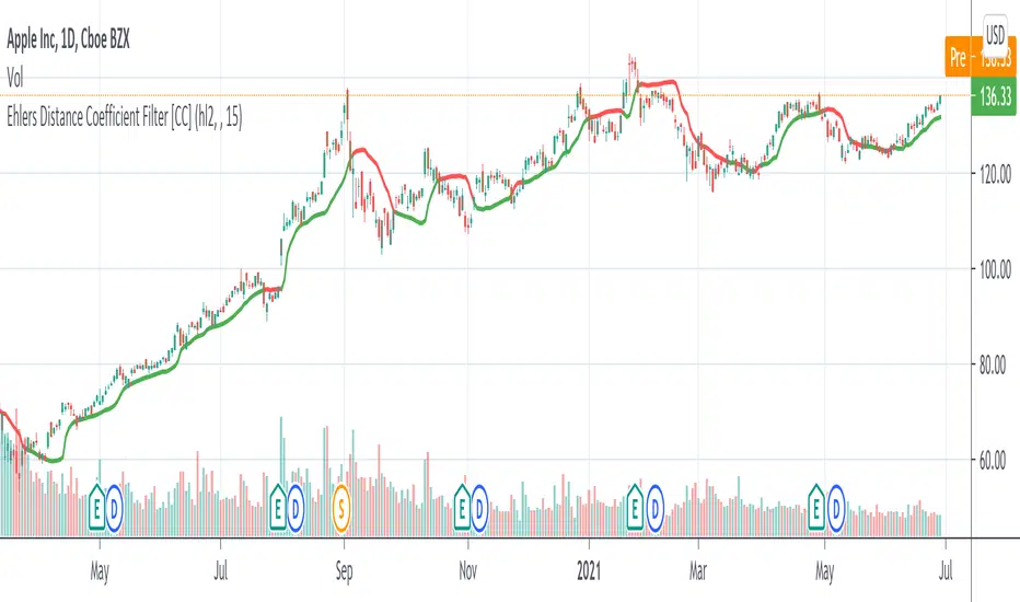 The Distance Coefficient Filter was created by John Ehlers and this is one of his more unknown moving averages. It works well because in an uptrend or downtrend it behaves more like a trailing stop system but it also deals with issues like pullbacks pretty quickly. I think it works well with the default values but let me know if you find a more profitable system. Buy when the indicator turns green and sell when it turns red.