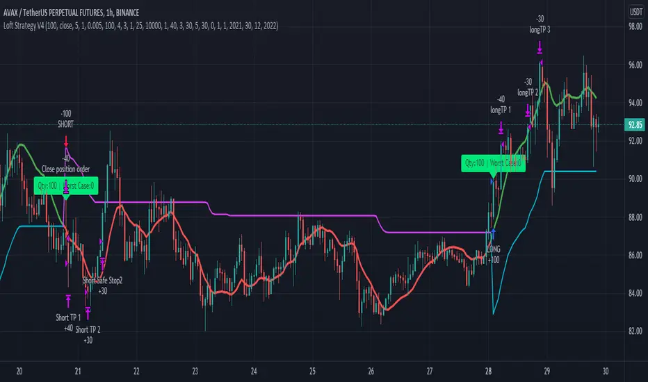 This strategy is an advanced version of the Loft Strategy V1, I shared earlier. (Loft Strategy V1 consists of a kalman filter (by alexgrover) and a "stop and reverse" line which is following and the kalman filter. If the price goes in the same direction as the position side, the "stop and reverse" line approaches the kalman filter as set on the "Approach Decrease Step" parameter.)