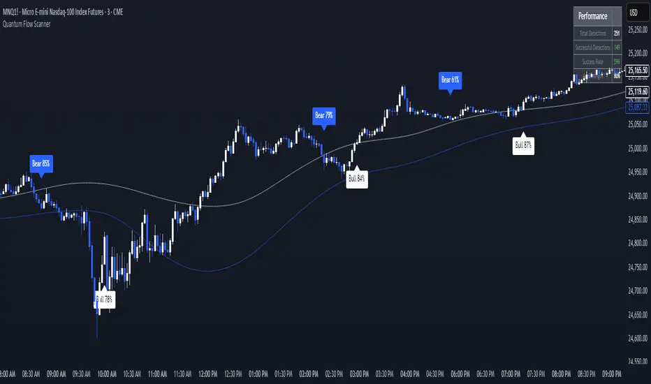 The Quantum Flow Scanner is a comprehensive technical analysis indicator that combines trend detection, momentum analysis, and dynamic band systems to identify potential market opportunities. This indicator uses advanced filtering techniques and multi-factor detection strength calculations to help traders make informed decisions.