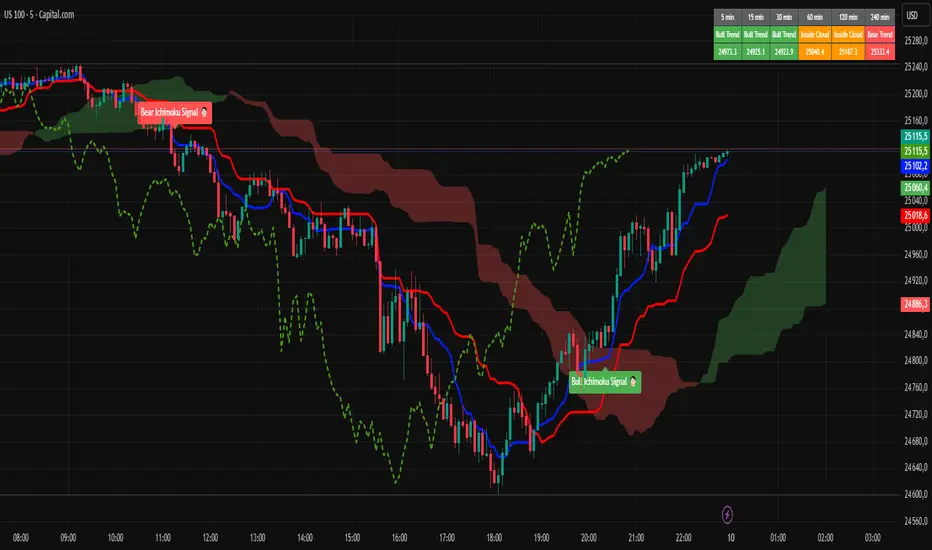 This advanced system detects Tenkan-Kijun crossovers, Kumo breakouts, and true Cloud confirmations — giving you only the cleanest, most reliable signals.