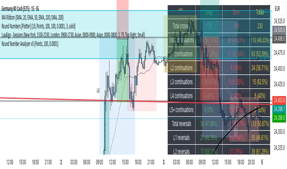 Round Number Analyzer v3 is an indicator designed to analyze how price interacts with round number levels (levels spaced at fixed intervals in points or pips).