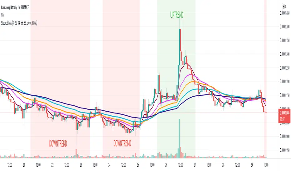 The Stacked Moving Averages indicator lets you see if a ticker is in an uptrend, downtrend, or no trend based on the condition of the moving averages. If the moving averages are stacked such that MA1>MA2>MA3>MA4>MA5, then that is described as an uptrend. If the moving averages are stacked such that MA5>MA4>MA3>MA2>MA1, then that is defined as a downtrend.