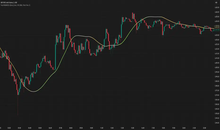 This script reimagines traditional moving averages by introducing floating-point period calculations, allowing for fractional lengths rather than being constrained to whole numbers. At its core, it provides SMA, WMA, and HMA variants that can work with any decimal length, which proves especially valuable when creating dynamic indicators or fine-tuning existing strategies.