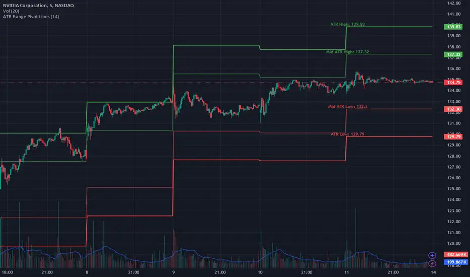 This Pine Script calculates and plots pivot lines based on ATR (Average True Range) value and closing price. It uses the previous trading day's ATR value to set static pivot levels for the current trading day. These pivot lines help traders identify potential support and resistance levels based on historical volatility. The script includes two main pivot lines—ATR High and ATR Low —and two midpoint lines between them for additional context. Labels are added to show the exact pivot values, with options to customize label positions.