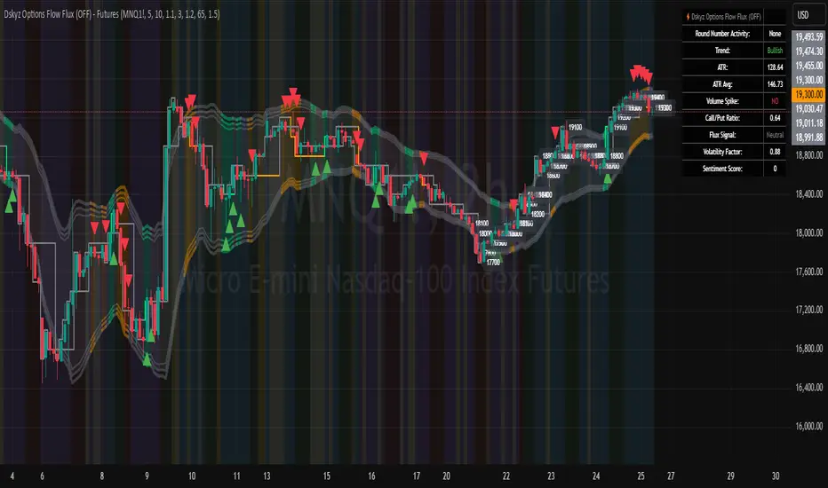 🧠 The Dskyz Options Flow Flux (OFF) - Futures indicator is a game changer for futures traders looking to tap into institutional activity with limited resources. Designed for TradingView this tool simulates options flow data (call/put volume and open interest) for futures contracts like MNQ MES NQ and ES giving u actionable insights through volume spike detection volatility adjustments and stunning visuals like aurora flux bands and round number levels. Whether u’re a beginner learning the ropes or a pro hunting for an edge this indicator delivers real time market sentiment and key price levels to boost ur trading game