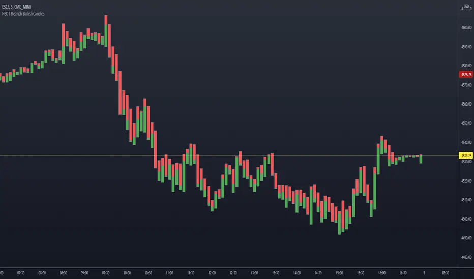 This is another interesting take on candlesticks . These Bearish-Bullish Candles do not show the wicks. Instead, the upper wick is made into a Red body and the lower wick is made into a Green body. If you match the candle body color in the chart settings (or turn off the candles completely), you get a unique way of seeing how Bearish or how Bullish a candle is because the wick will now match the body size and color.