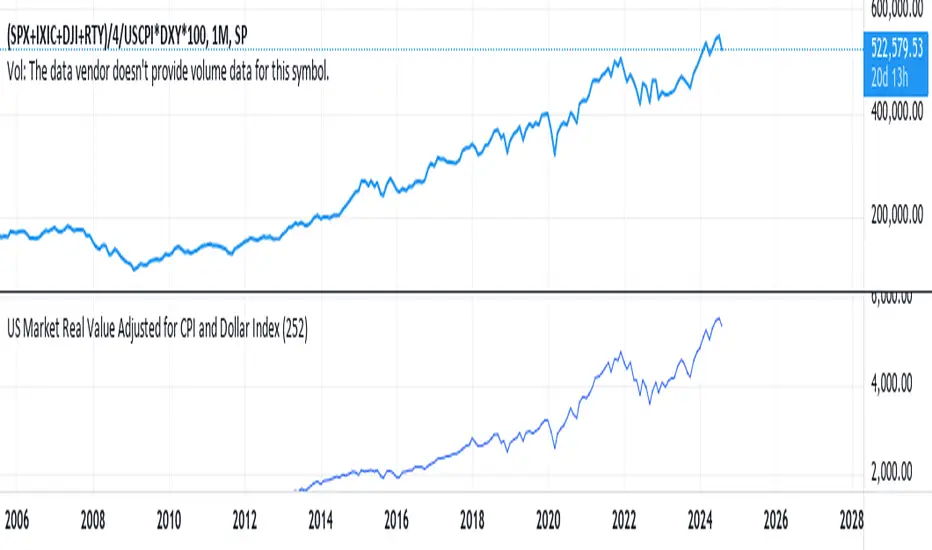 US Market Real Value Adjusted for CPI and Dollar IndexProvides quick access to this formula: (SP:SPX+NASDAQ_DLY:IXIC+TVC:DJI+CAPITALCOM:RTY)/4/(ECONOMICS:USCPI*TVC:DXY*100)