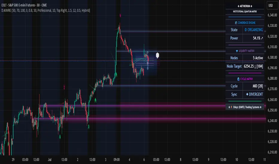 The Aetherium Institutional Market Resonance Engine (AIMRE) is a multi-faceted analysis system designed to move beyond conventional indicators and decode the market's underlying structure as dictated by institutional capital flow. Its philosophy is built on a singular premise: significant market moves are preceded by a convergence of [u]context[/u], [u]location[/u], and [u]timing[/u]. Aetherium quantifies these three dimensions through a revolutionary three-pillar architecture.