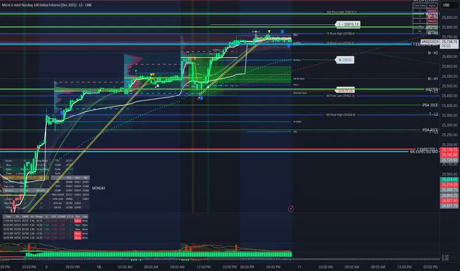 Designed as the lower-pane companion to the War Room Combined HUD, this dashboard provides a 15-minute cadence flow log that captures the heartbeat of each session in real time. It helps visualize how intraday structure, delta flow, and bias evolve block-by-block.