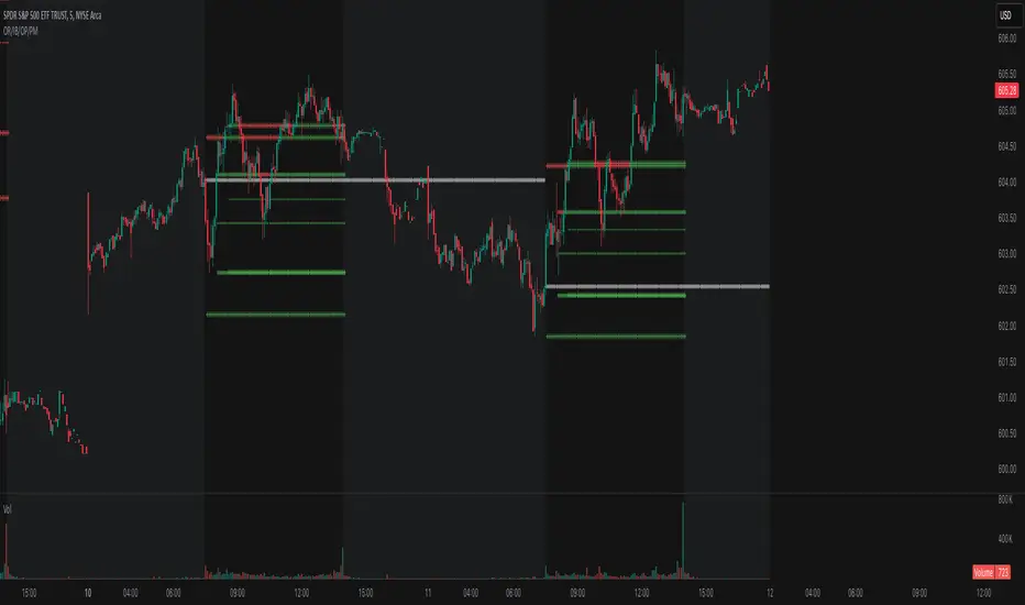 This custom TradingView indicator provides a comprehensive view of key price levels for intraday trading, specifically designed to track important levels from the Opening Range (OR), Initial Balance (IB), Opening Price (OP), and Pre-market session (PM). These levels are essential for traders to gauge potential market movements and identify critical areas of support and resistance.
