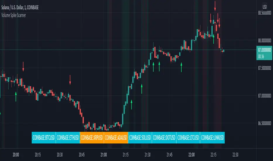 The scanner can be customized to have all of your favorite tickers by changing the tickers used in the indicator settings at the bottom. When no volume growth or spikes are detected, the ticker will show as light blue. When volume spikes or growth is detected, the ticker will turn orange to notify you.