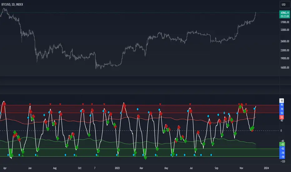 -Strong buy in oversold zone and strong sell in overbought zone. (Triangles at the top red and at the bottom green)