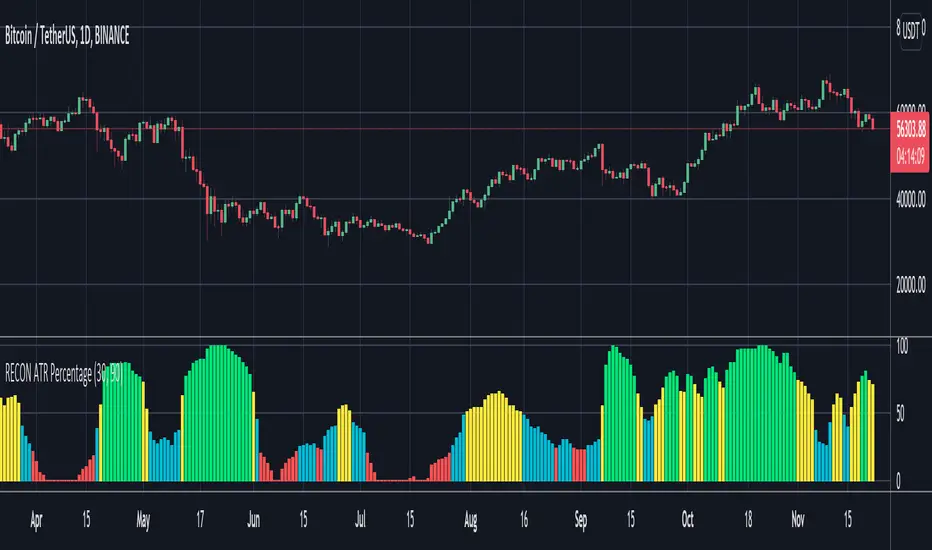The RECON ATR Volatility Percentage indicator calculates the Average True Range (ATR) as a percentage.